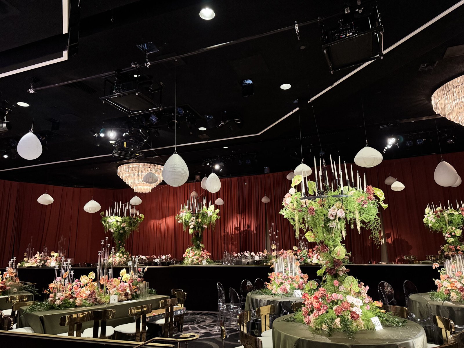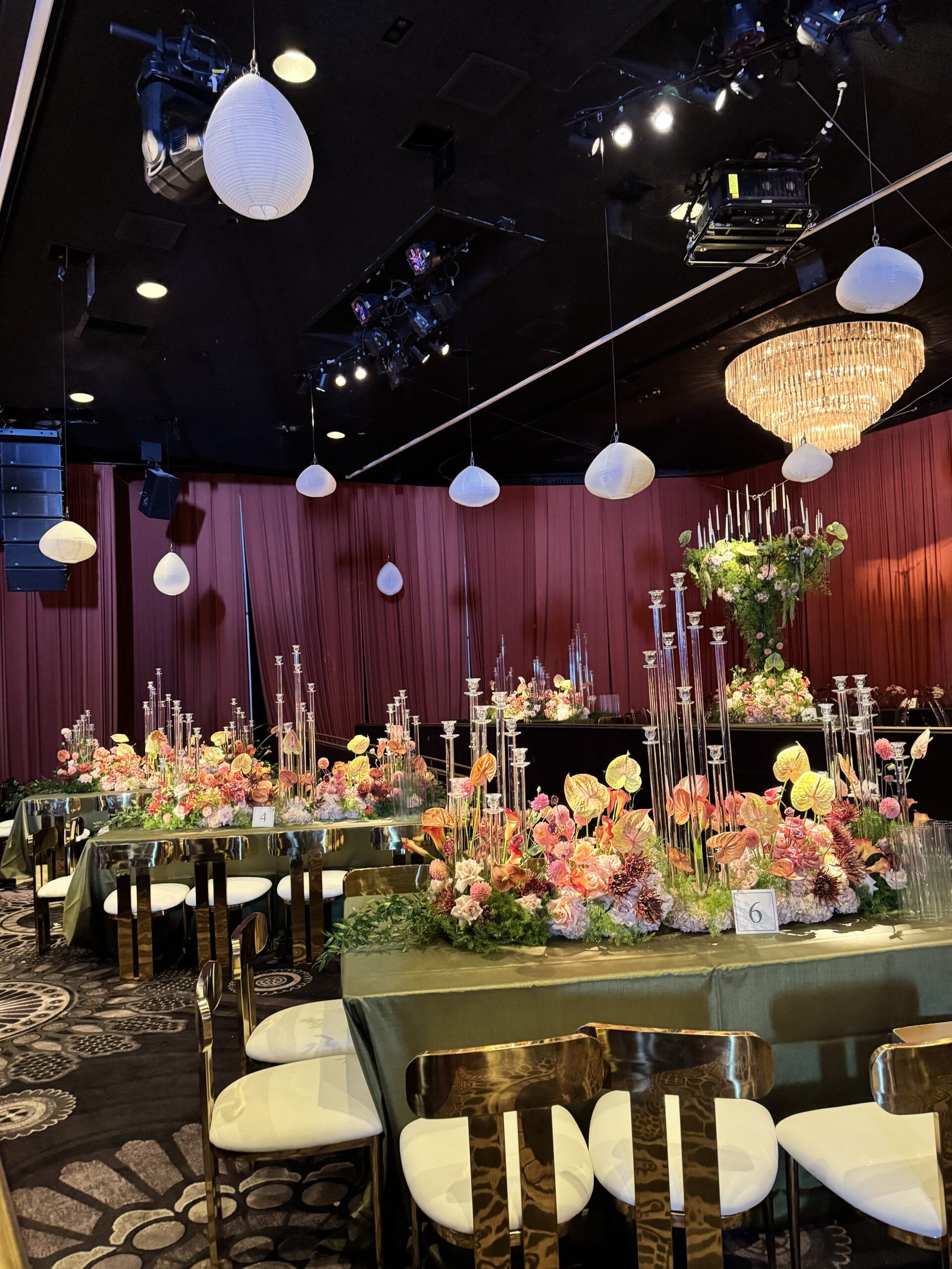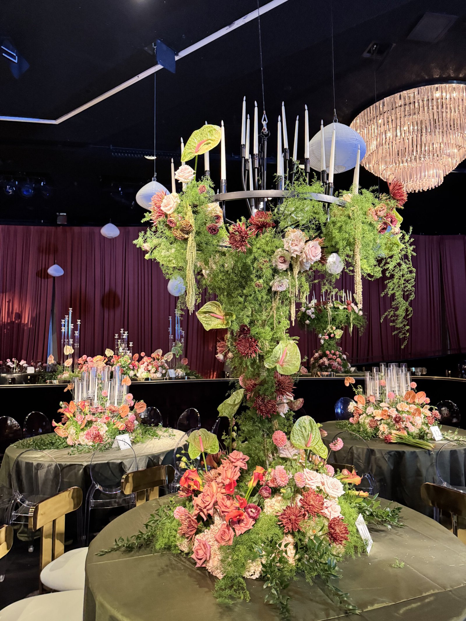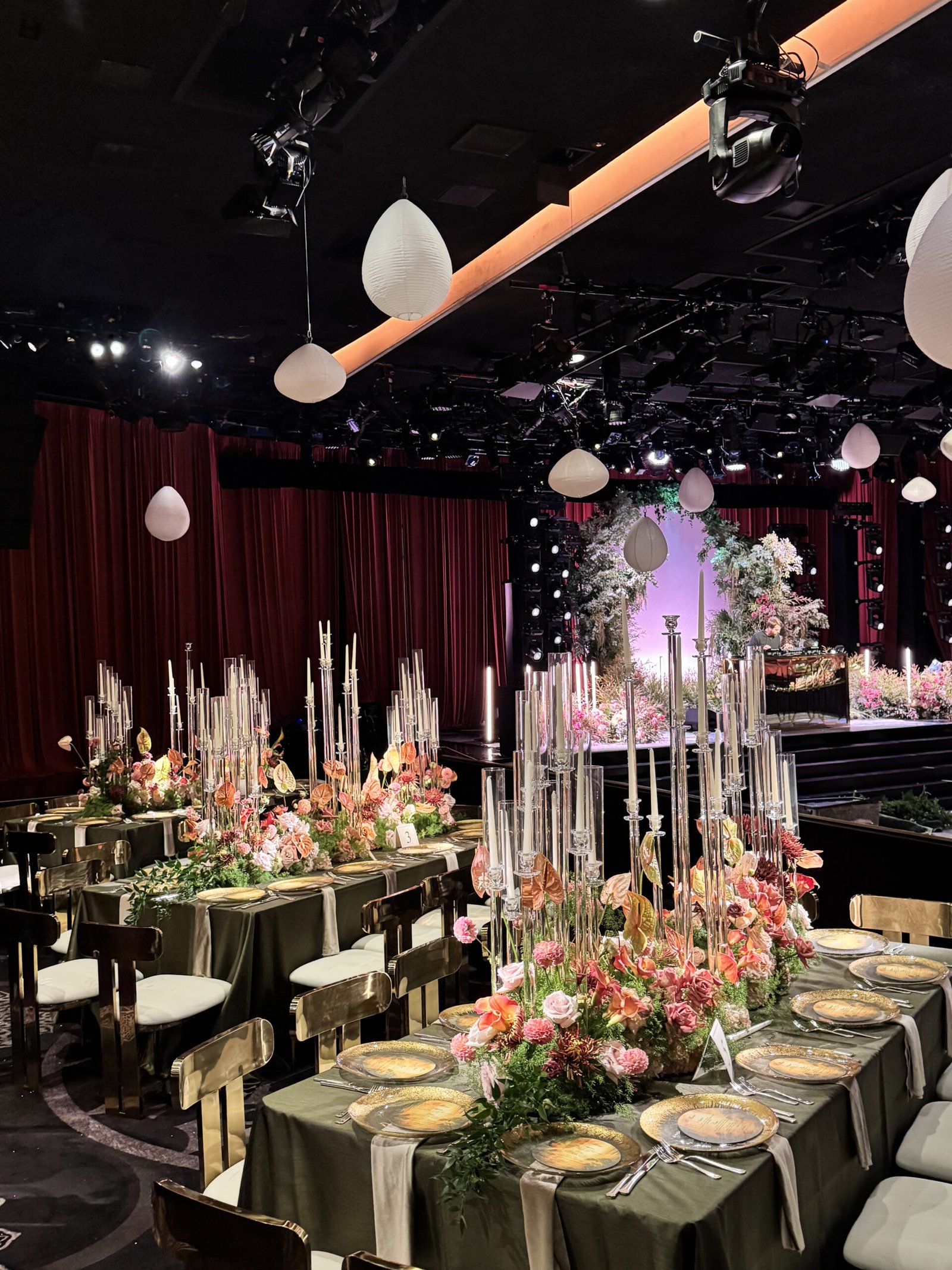 The tables were decorated with lush arrangements of roses, anthuriums, and seasonal flowers, complemented by elegant candlelight that filled the ballroom with warmth and intimacy. Deep green linens with golden accents added a timeless touch to the celebration.