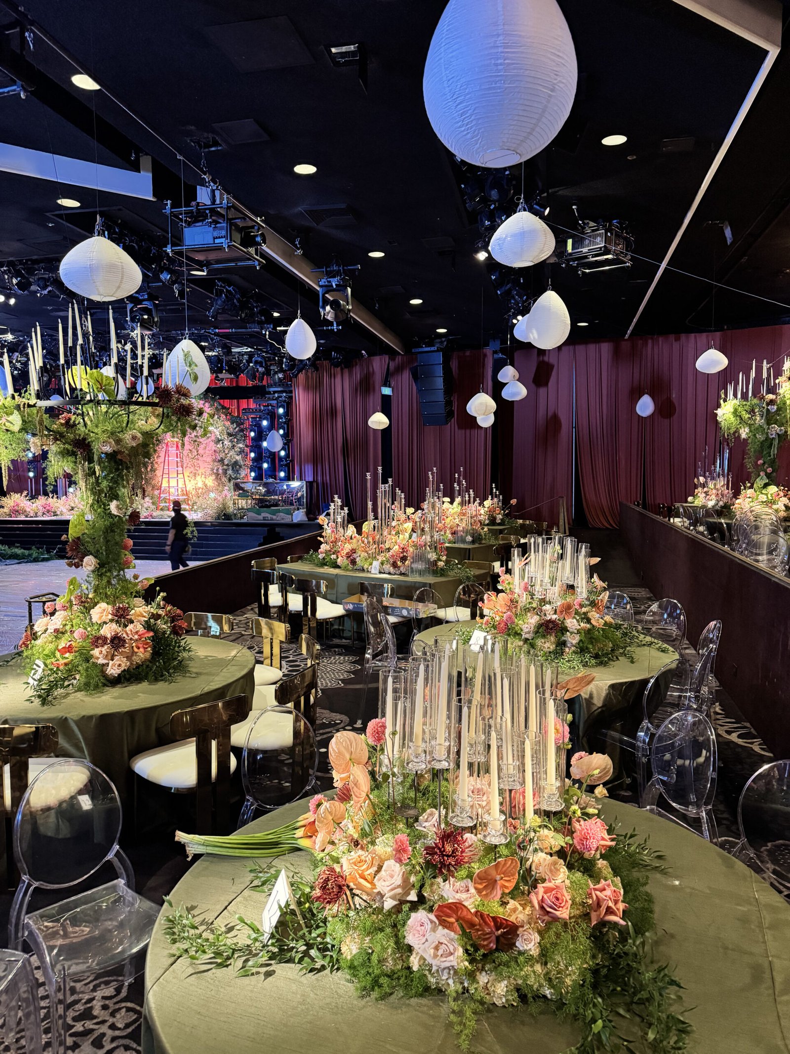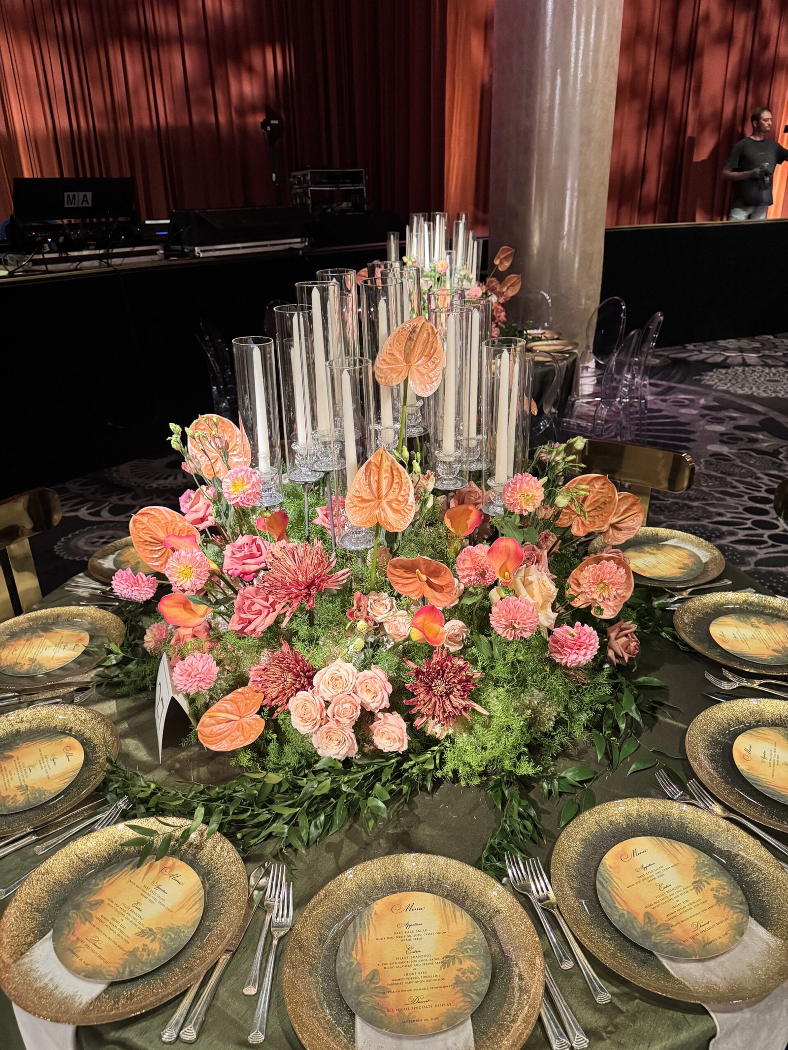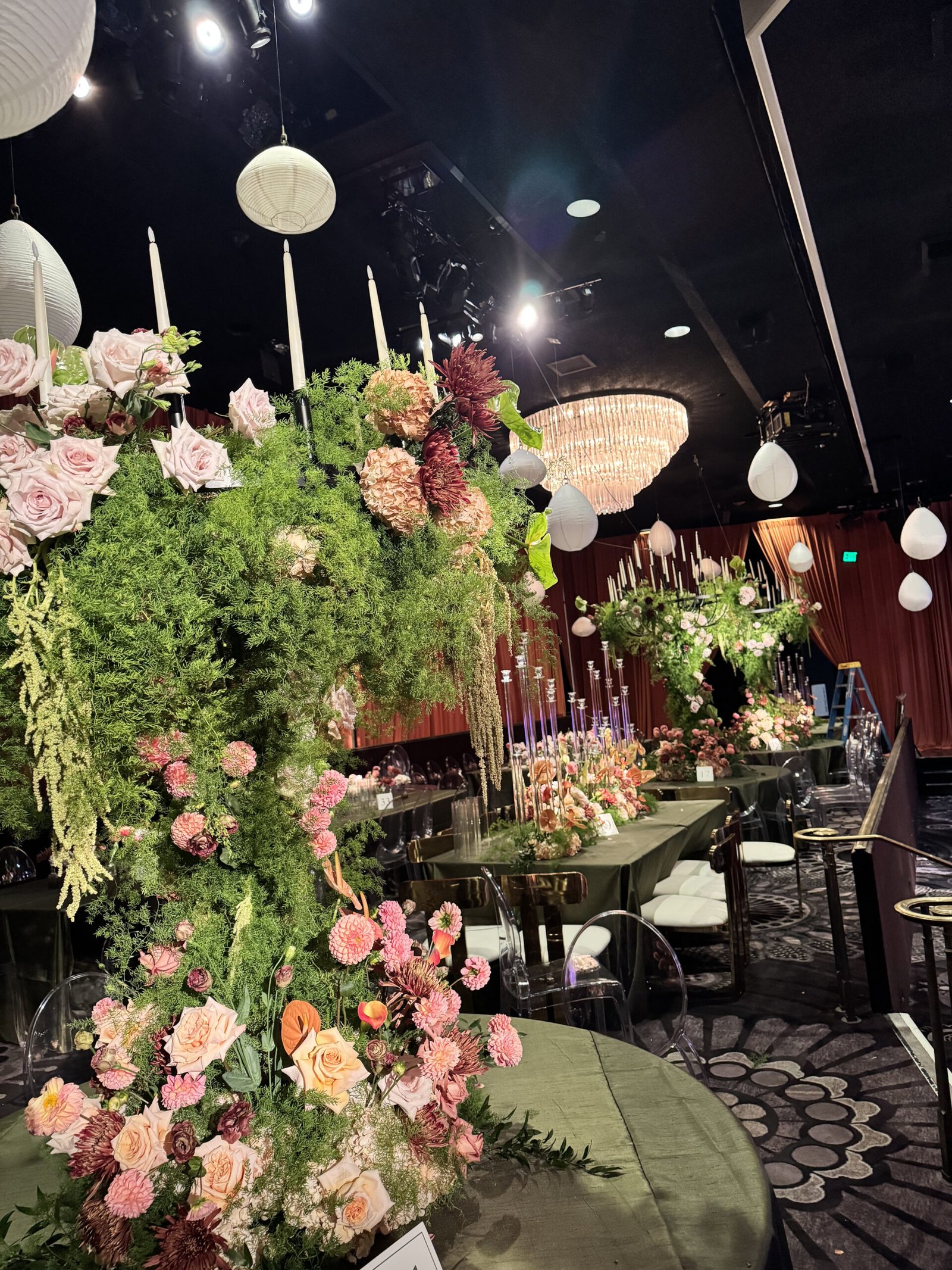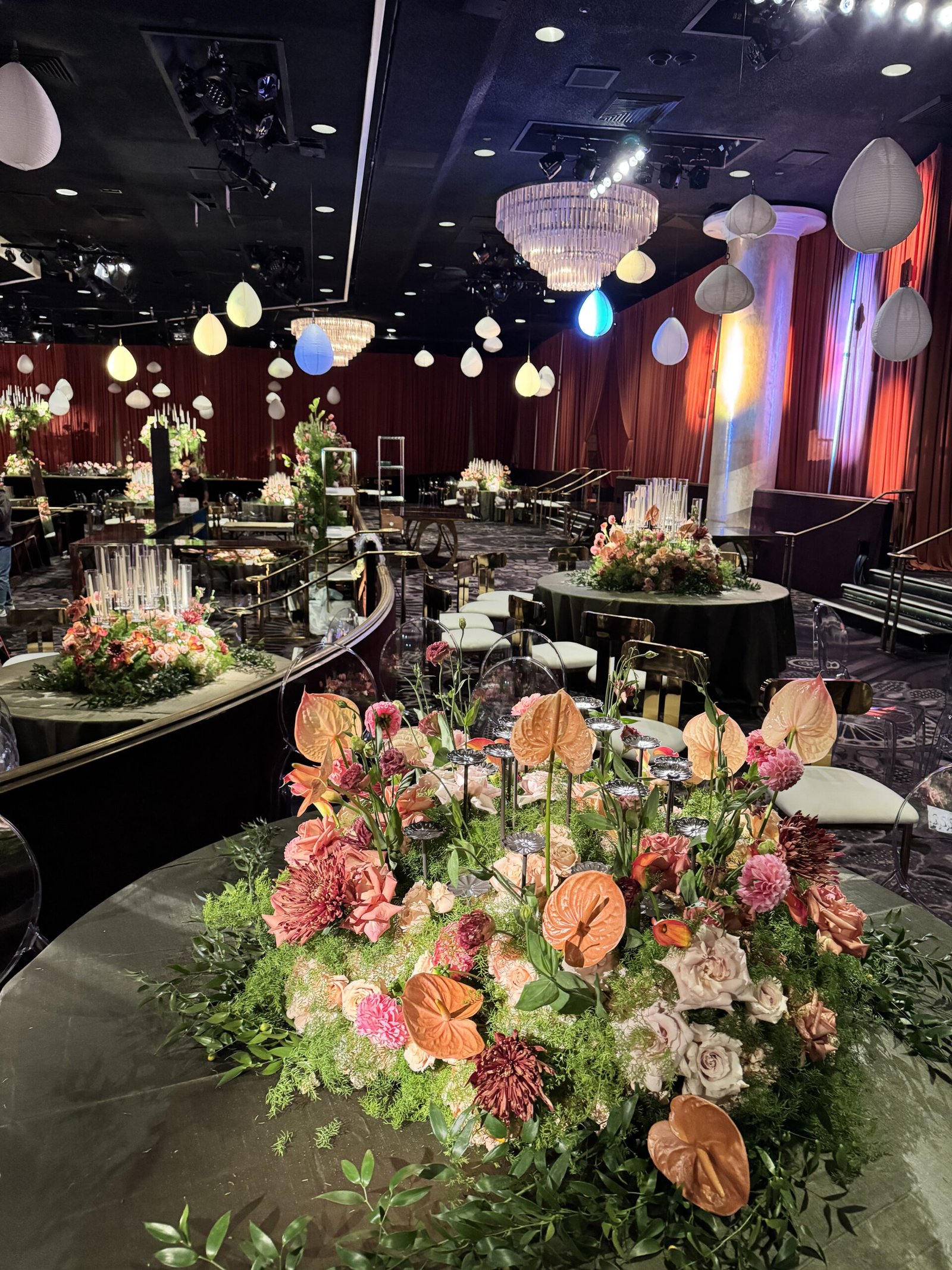 The tables were decorated with lush arrangements of roses, anthuriums, and seasonal flowers, complemented by elegant candlelight that filled the ballroom with warmth and intimacy. Deep green linens with golden accents added a timeless touch to the celebration.