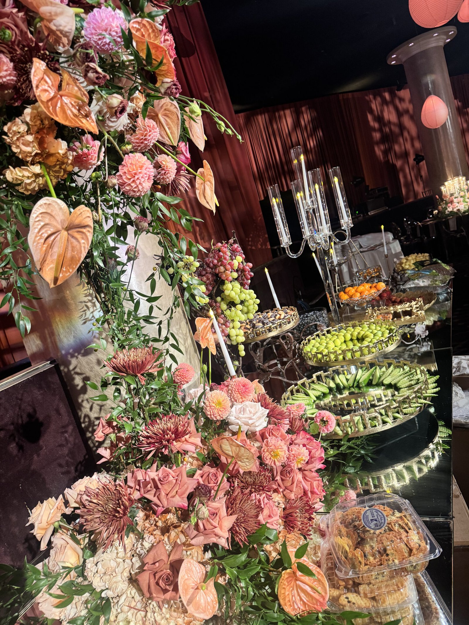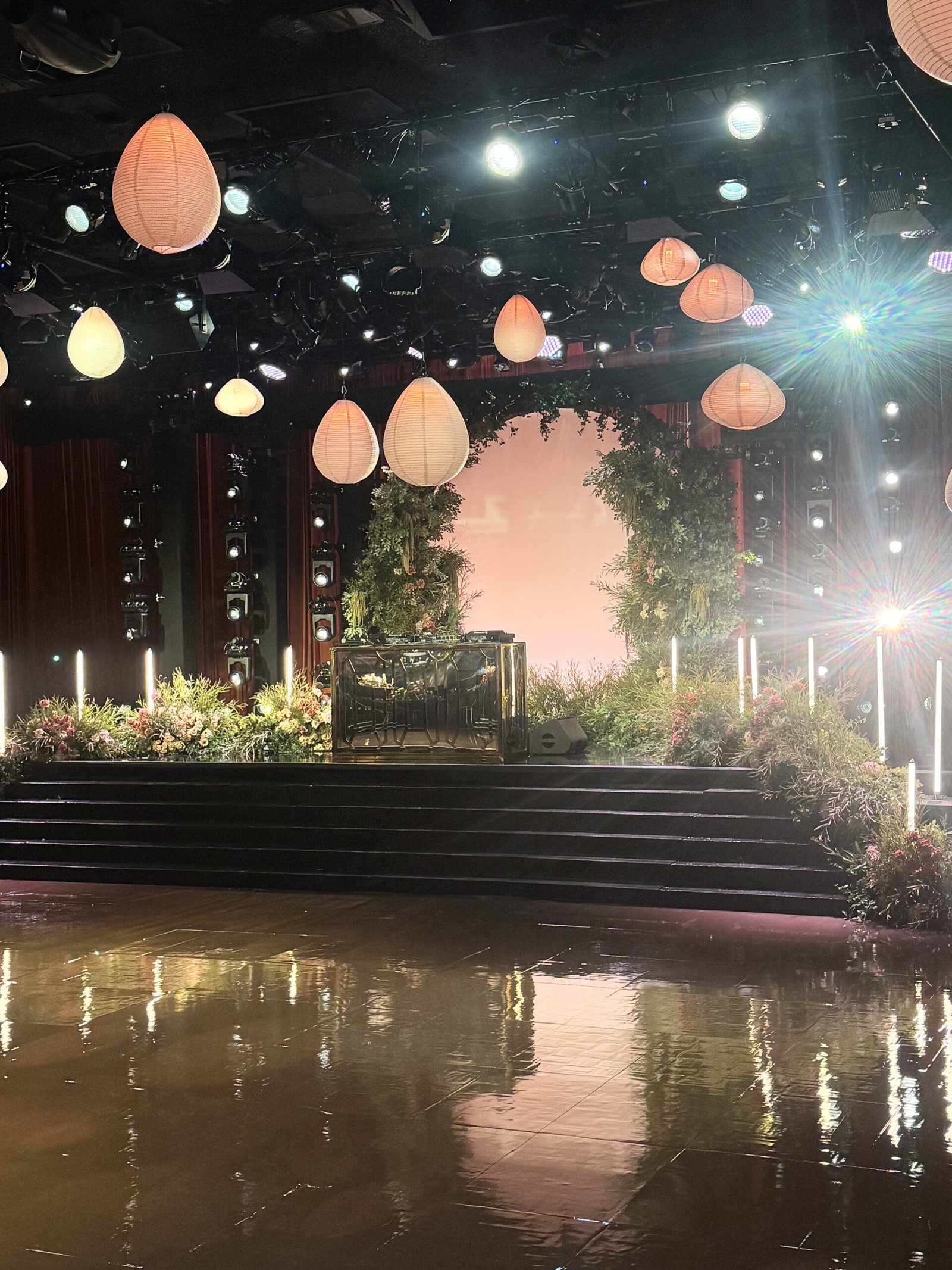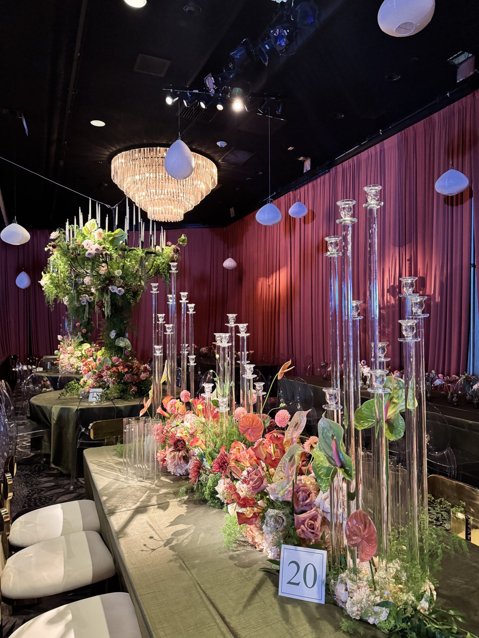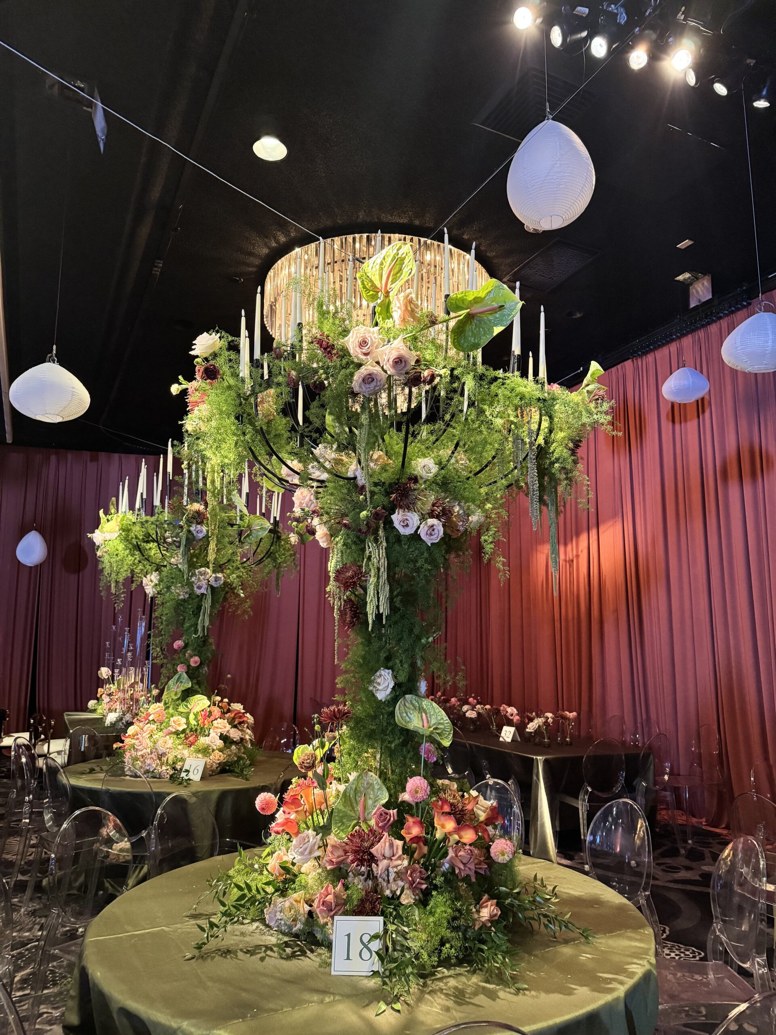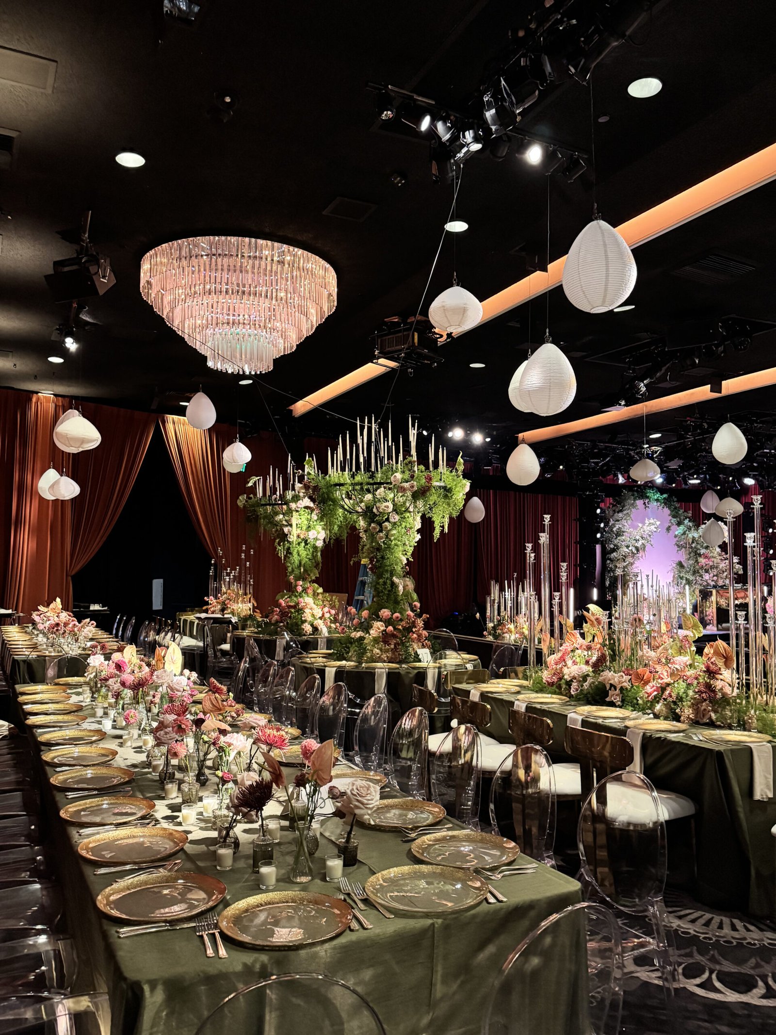 Towering floral chandeliers draped with greenery created a breathtaking centerpiece, making the space feel both grand and magical. Guests were amazed by the atmosphere, describing it as a fairytale setting brought to life.