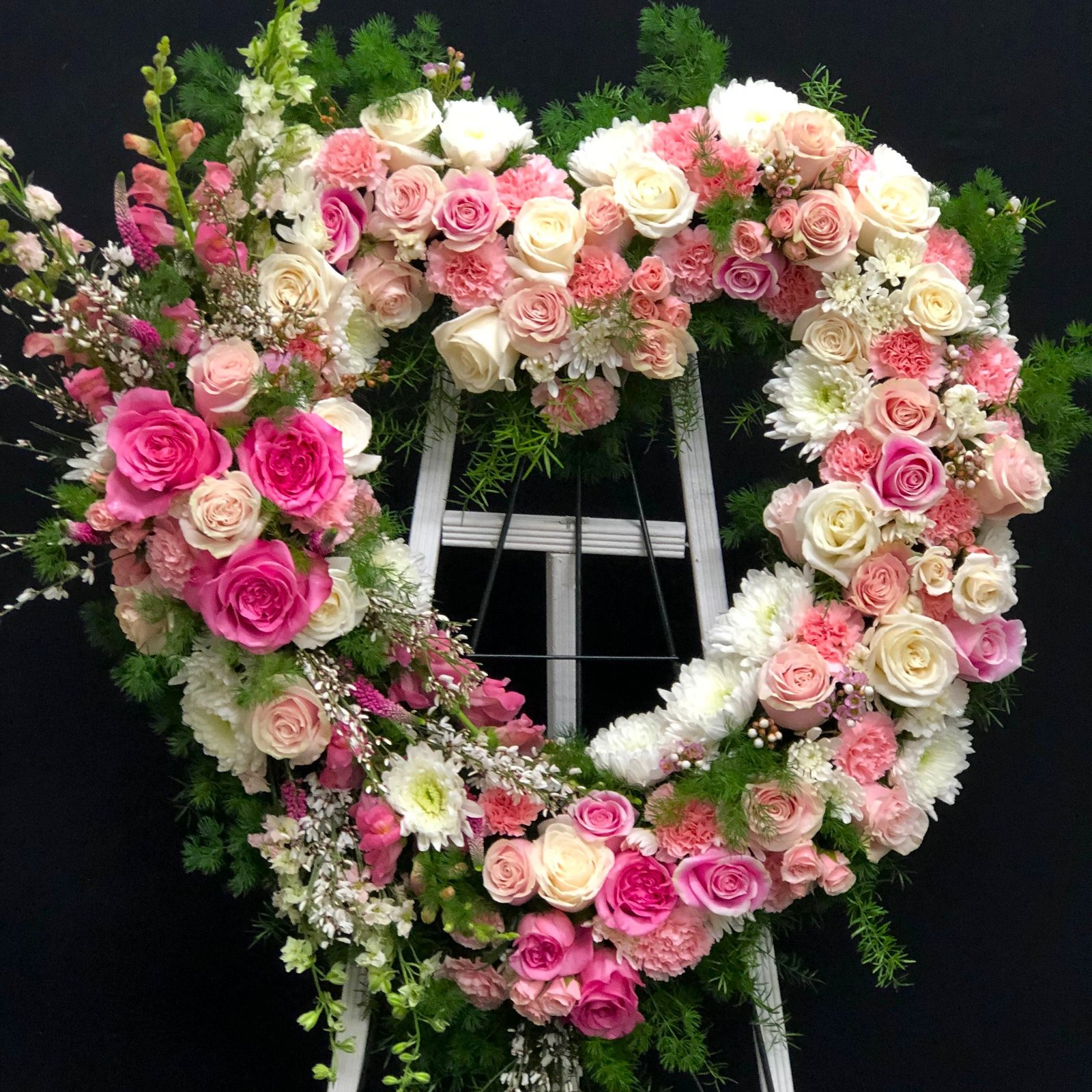 A heartfelt tribute in elegant white, this stunning heart-shaped standing wreath features a lavish arrangement of lilies, roses, and chrysanthemums, complemented by rich greenery. Its graceful heart design symbolizes eternal love and cherished memories, offering comfort and serenity during difficult times. A refined and luxurious expression of sympathy, perfect for honoring a beloved life with sophistication and compassion.