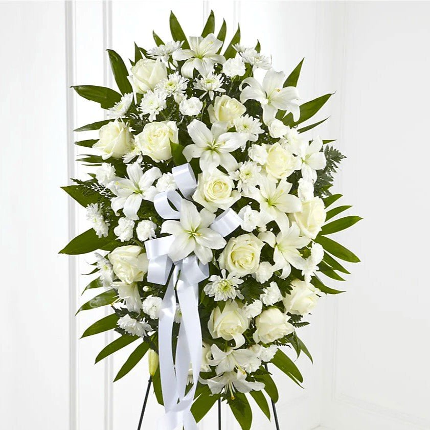 An elegant and sophisticated standing arrangement created in timeless white with rich greenery accents. Its graceful design conveys serenity, respect, and heartfelt remembrance, making it a powerful expression of love and support during times of loss.