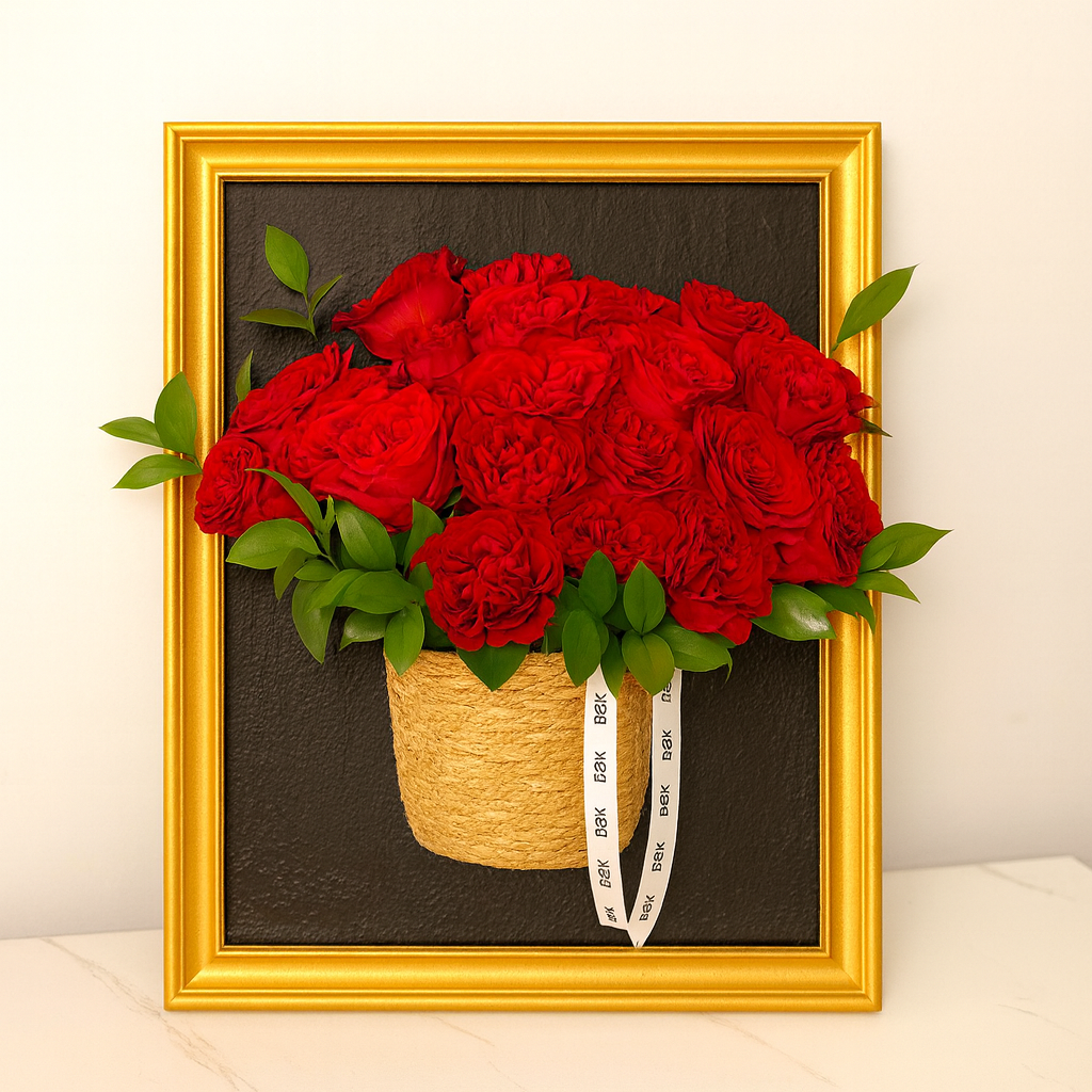 Experience the timeless elegance of Art Passion, a handcrafted floral masterpiece designed to transform any space into a scene of romance and sophistication. This unique arrangement features a lush bouquet of premium red roses, beautifully arranged in a woven basket and framed like a piece of art — a perfect blend of nature and luxury.